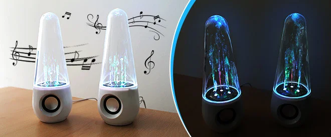 Zábavné reproduktory s malou svetelnou vodnou urobia súkromnou šou na vašom stole. Ukážte priateľom, že máte zmysel pre originalitu a viete navodiť dokonalú atmosféru. Fontánka v reproduktoroch sa pohybuje podľa intenzity zvuku a štýlu hudby. Rovnako svetlo vytvára pestrofarebné očarujúce kombinácie, do ktorých sa zamilujete.