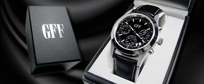 Elegantné a luxusne vyzerajúce hodinky model GFF Chronograph skrášlia každého chlapa. Hodinky kombinujú eleganciu čiernej a striebornej farby. Strieborný kov vizuálne podčiarkuje čierny ciferník, na ktorom nájdete tri menšie ciferníky.
