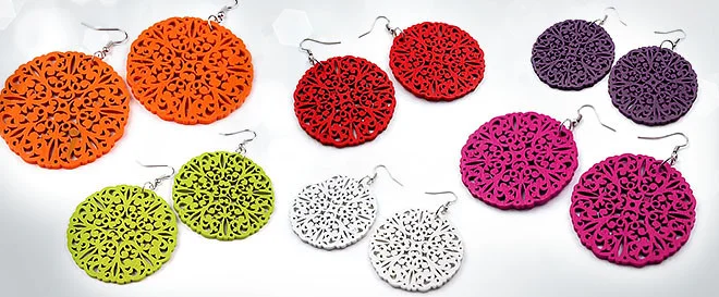Krásne filigánové kruhové náušnice o priemere 50 mm. Všetky modely sú vyrobené z dreva.