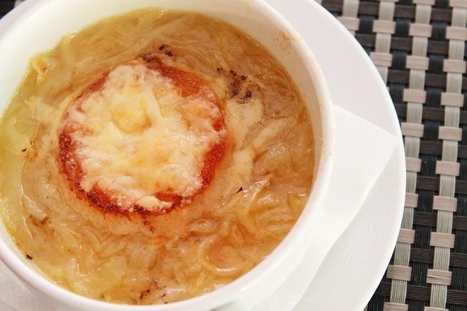 - 2 × 0,25 l Soupe à l'oignon gratinée (Tradičná cibuľačka s gratinovaným syrovým krutónom)