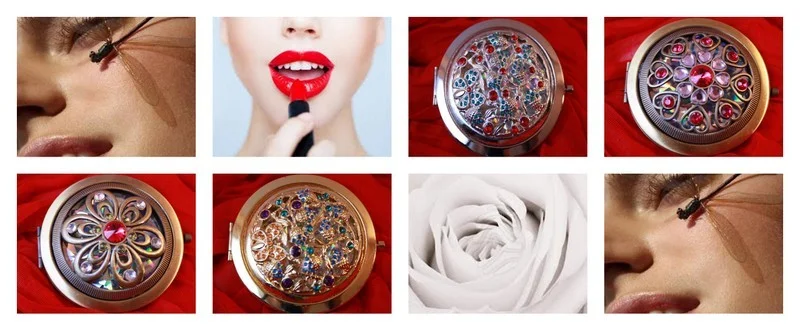 Imidž dokonalej dámy doplní elegantné kozmetické zrkadielko vyrobené z kvalitného chrómu s trojnásobným zväčšením. Je zdobené rôznymi motívmi s kamienkami úžasných farieb.