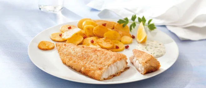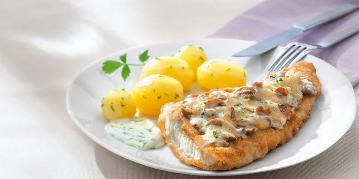 - Grilovaná tmavá treska (160 g) zapečená so šampiňónmi (125 g), varené zemiaky (200 g), omáčka