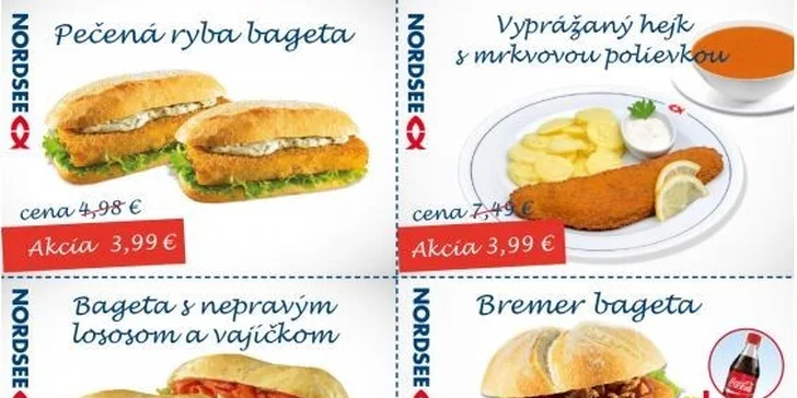 | Pečená ryba bageta (235g) – morský losos (90g), šalát, dressing za 3,99 € Bageta s nepravým lososom a vajíčko (160g) – nepravý losos , vajce , šalát + cola za 3,99 € Grilovaná tmavá treska (160 g) zapečená so šampiňónmi (125 g), varené zemiaky (200 g), omáčka za 6,49 € Vyprážaný hejk (150g), zemiakový šalát (200g) – omáčka , mrkvovo-zázvorová polievka s kokosovým mliekom (200g) za 3,99€ Bremer bageta (219g)- frikadela , šalát , sušená cibuľa , kečup + cola za 3,99 € Miešaná krabička (220g)- vyprážané krevety, rybie nugetky, americké zemiaky + cola za 4 € |