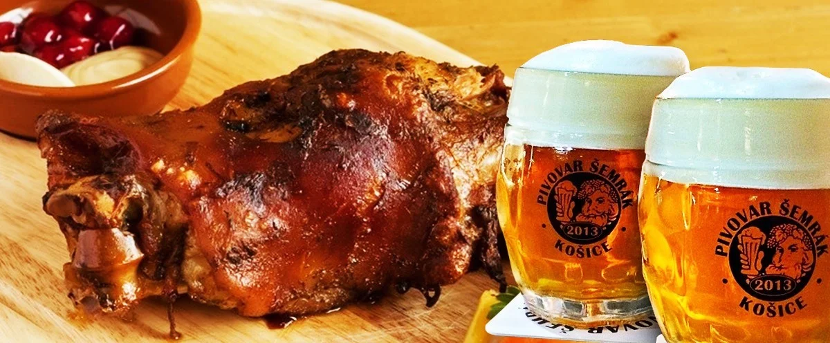 - pečené bravčové koleno (300 g bravčové koleno bez kosti pečené na pive, baranie rohy, feferónky, chren, horčica, chlieb)