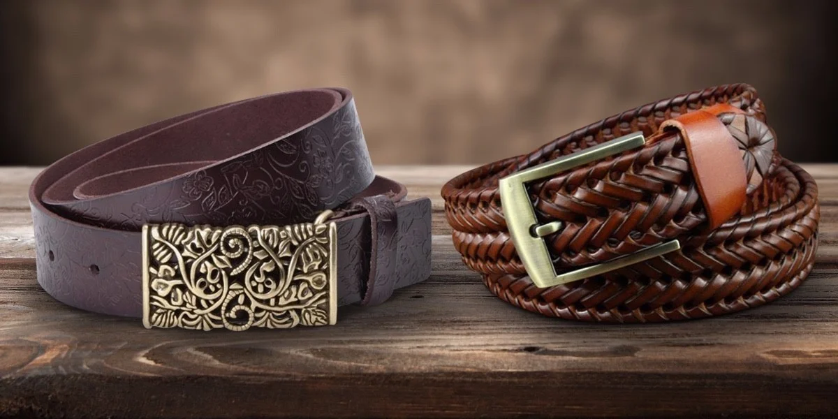 Kožené opasky s ozdobnou sponou a razeným vzorom