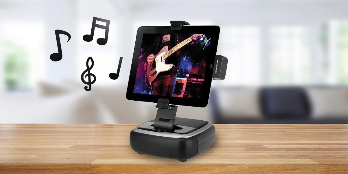 Táto polohovateľná stanica s kvalitným reproduktorom sa otáča pre horizontálne a vertikálne prezeranie videa. Prístroj sa nabíja, zatiaľ čo vám umožní sledovať filmy, počúvať hudbu alebo hrať hry.