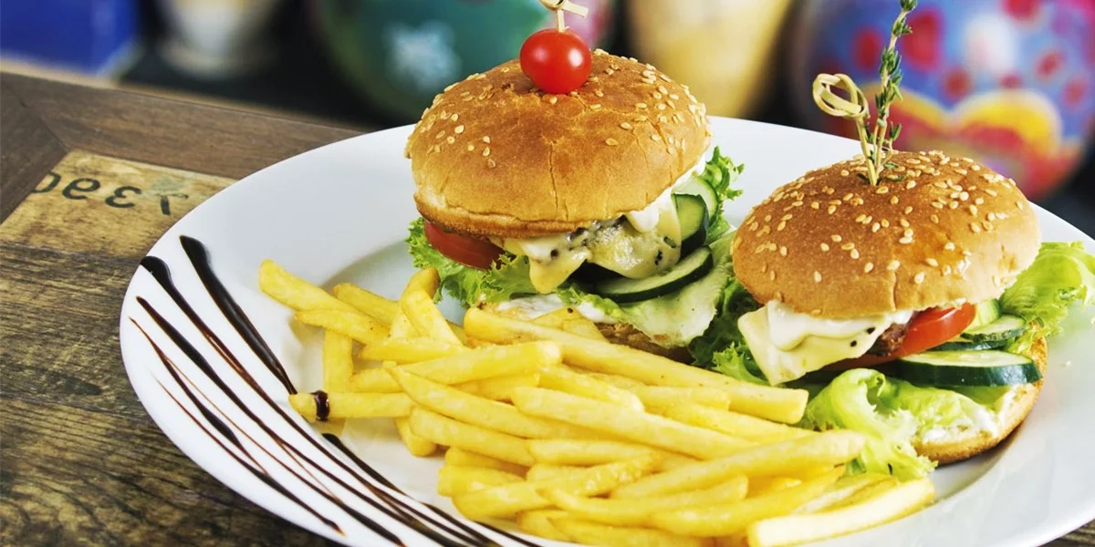 Hamburger si môžete vybrať buď kurací alebo hovädzí. Dva burgre a hranolky? Máliť sa vám nebude a smädní tiež neodídete. Na výber máte buď nealko mätový drink alebo orosené pivko.