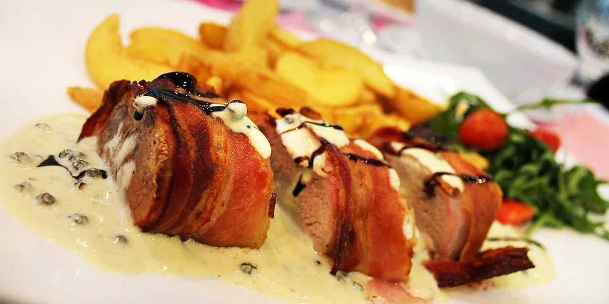 - 200 g Grilované kuracie prsia plnené sušenou paradajkou, mozarellou a bazalkou + 200 g Pečené zemiaky alebo 200 g Grilovaná bravčová panenka obalená v slaninke s omáčkou zo zeleného korenia + 200 g Pečené zemiaky