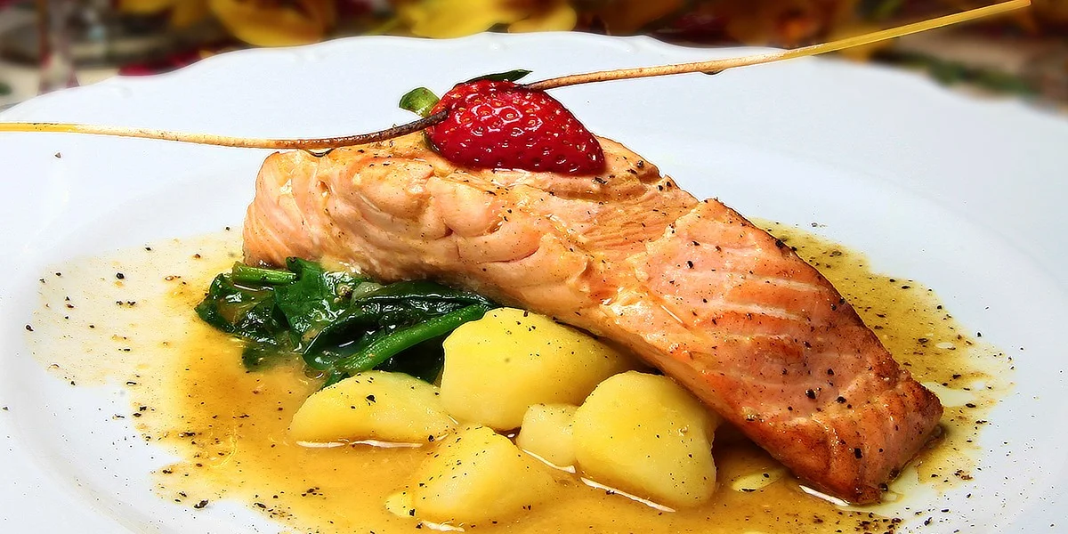 - 2 × 110 g Filet z čerstvého lososa na pomarančovej omáčke so špenátom a varenými zemiakmi