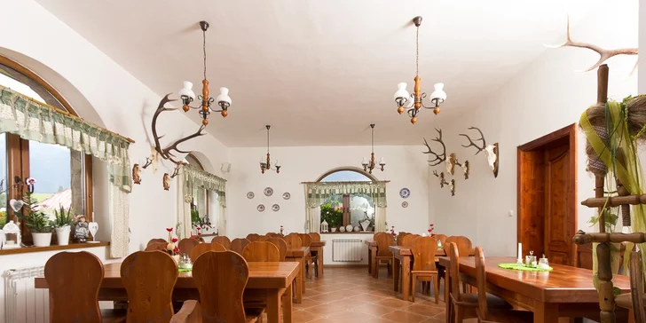 Ubytovaní budete v priestranných dvojlôžkových izbách. Samozrejmosťou v izbách je TV prijímač so satelitným príjmom a možnosť pripojiť sa k internetu (zdarma). Každá z ponúkaných izieb má vlastnú kúpeľňu s WC. V penzióne sa nachádza spoločenská miestnosť, v ktorej si môžete zahrať stolný futbal, biliard, stolný tenis a iné spoločenské hry. K dispozícii je hosťom sauna, ohnisko a bezplatné parkovisko. Samozrejmosťou je aj detský kútik, kde sa Vaše deti nebudú určite nudiť. V reštaurácii, ktorá je súčasťou penziónu, máte možnosť ochutnať špeciality šéfkuchára. V rámci kupónu máte aj chutné domáce raňajky. Celkovú atmosféru reštaurácie dopĺňa prekrásny výhľad na Belianske Tatry a Spišskú Maguru. |