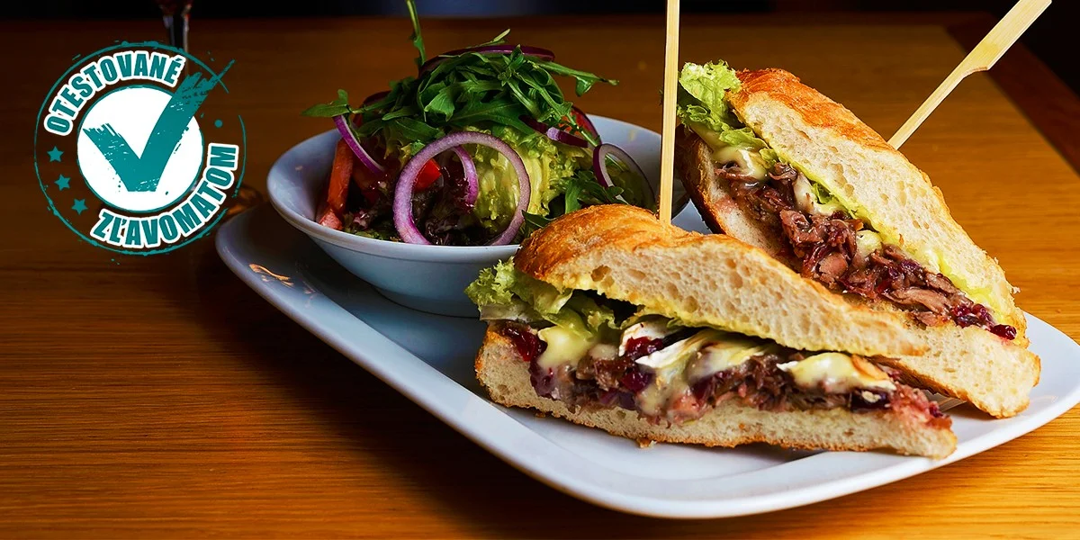 - 150 g Duck pulled burger s Camembertom (natrhané jemné štavnaté kačacie mäso s listovým šalátom, karamelizovanou cibuľkou, brusnicami a Camembertom)