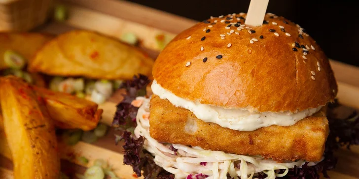 - 1× 300 g hamburger s rybou (100 g aljašská treska v bylinkách, domáca žemľa od pekára, ľadový šalát, coleslaw, 50g domáca tatárska)
