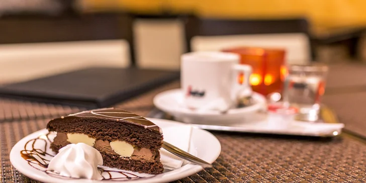 Taliansky koláč z belgickej čokolády v reštaurácii s jemným nádychom Egypta v reštaurácii Kleopatra. A k tomu výborná kávička!