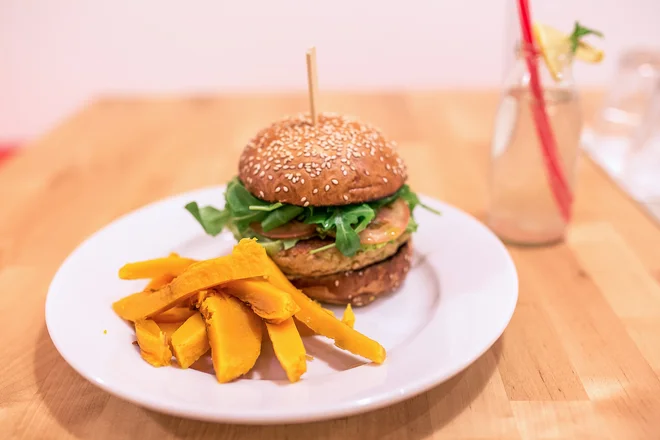 1× 236 g Cícerový burger s tekvicovými hranolčekmi a lahodnou limonádou z domáceho sirupu pre 1 osobu