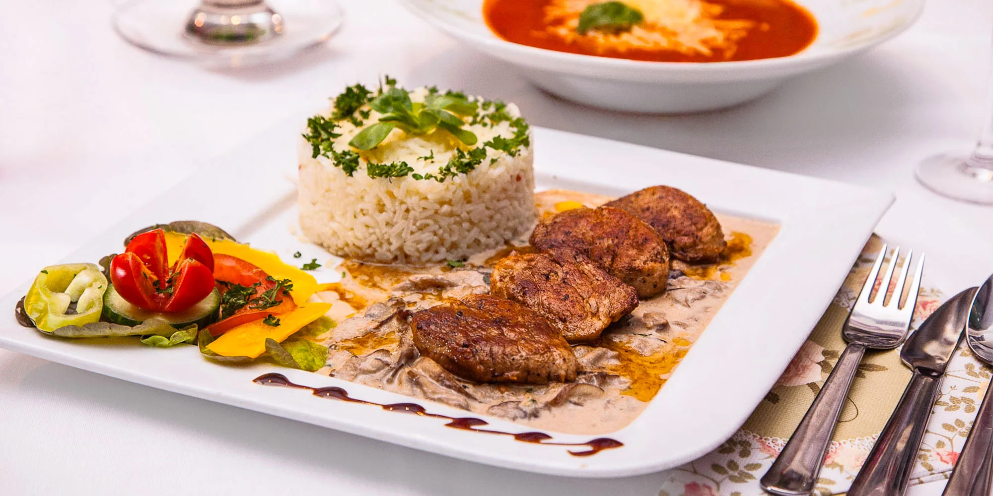 - 2 x Hlavné jedlo: 150 g Bravčová panenka s hríbovou omáčkou, 100 g ryža
