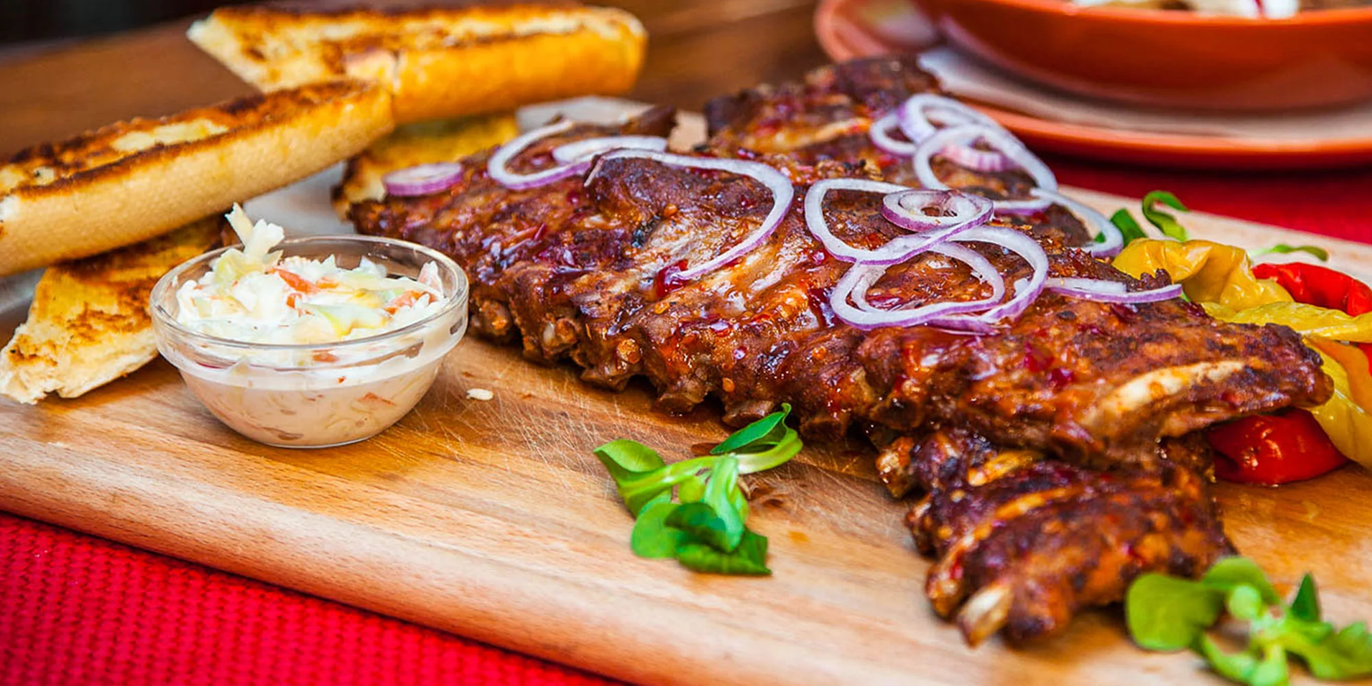 Pečené bravčové rebierka v pikantnej marináde s chrumkavou cesnakovou bagetou, sweet chilli salsou, šalátom coleslaw a baraními rohmi.