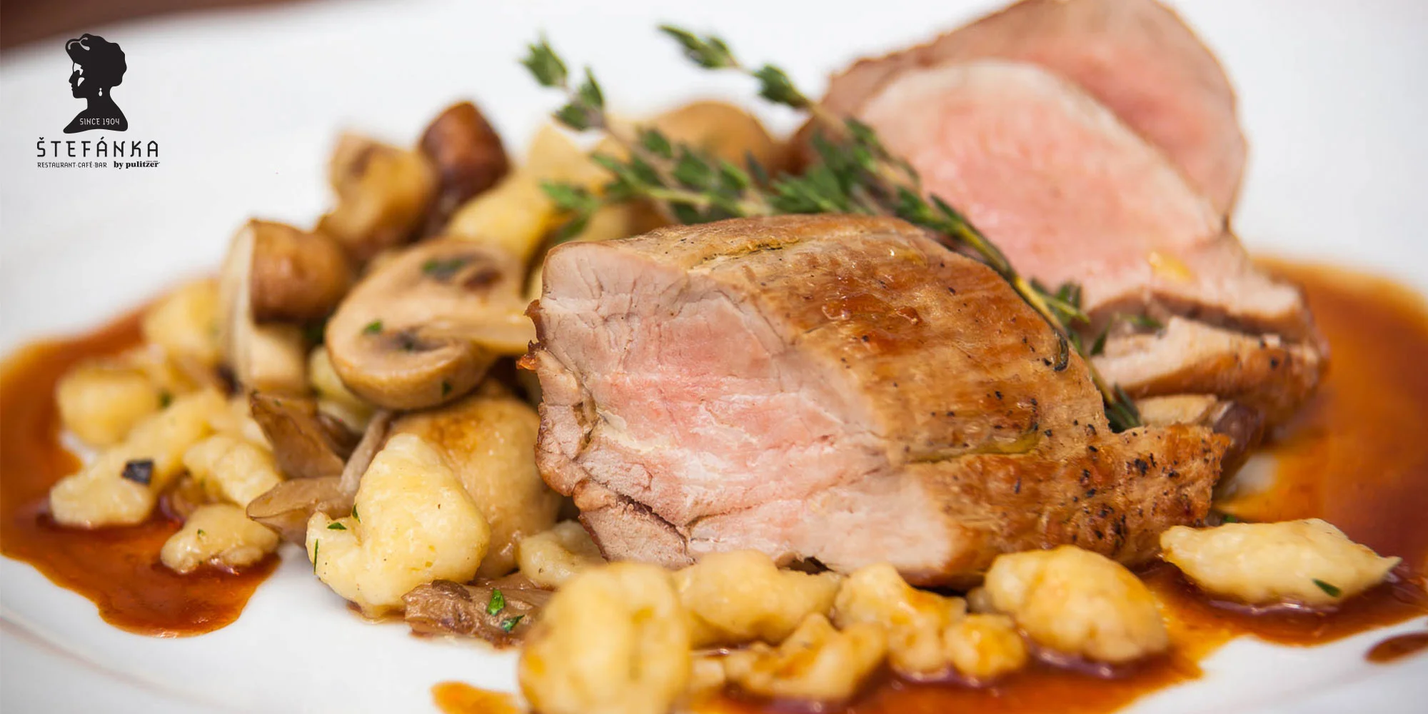 Nechajte sa zviesť gastronomickým zážitkom regionálnej a svetovej kuchyne pod vedením profesionálneho tímu, ktorý vám tentokrát pripraví fantastické, v ústach rozplývajúce sa mäsko, konkrétne na bylinkách marinované medailónky z bravčovej panenky. Mäso vám naservírujú s domácimi zemiakovými haluškami s lesnými hríbmi a bylinkami.
