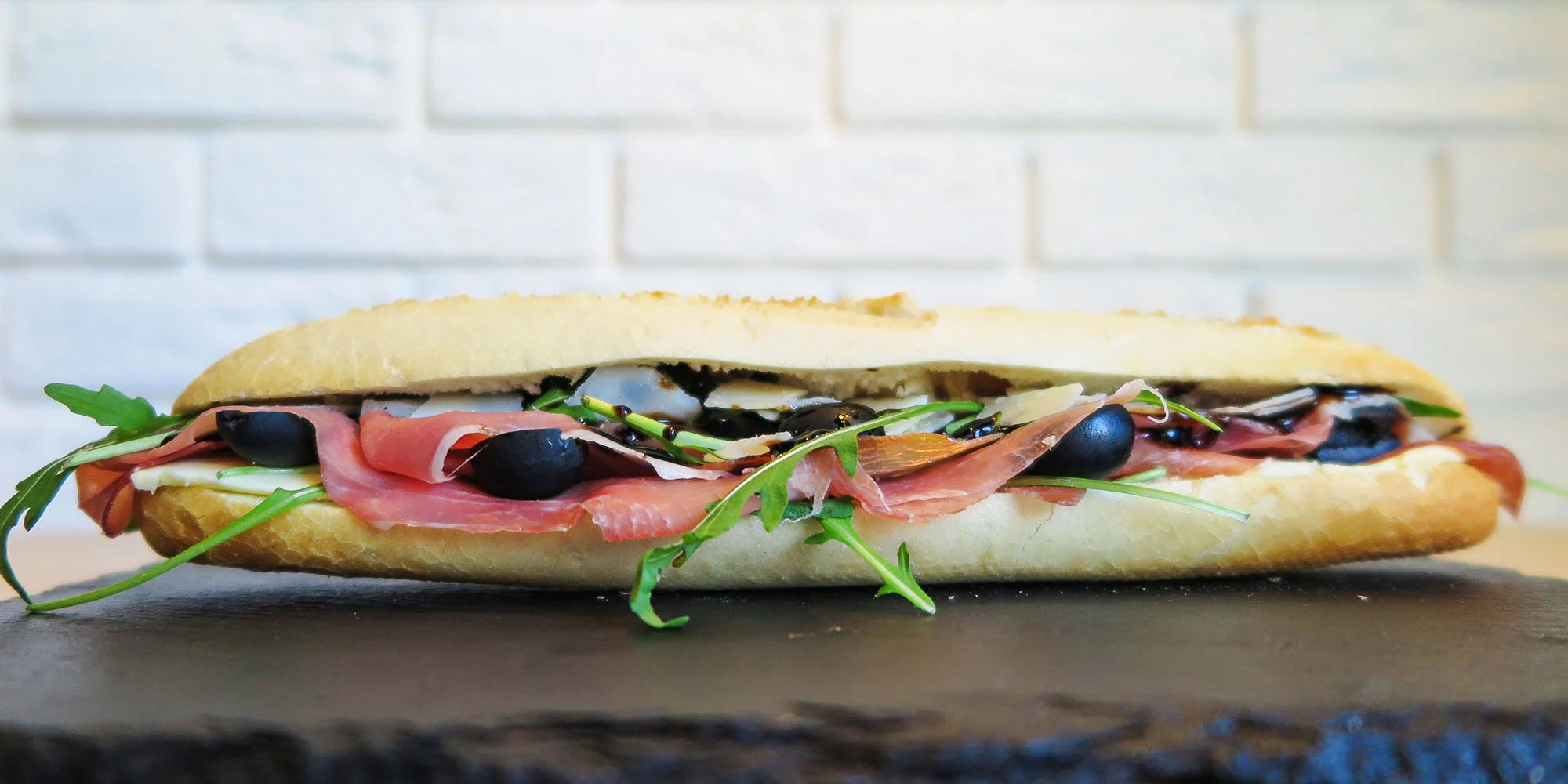 - Prosciutto bageta - bageta biela alebo cereálna, bylinkové maslo, rukola, prosciutto, čierne olivy, parmezán