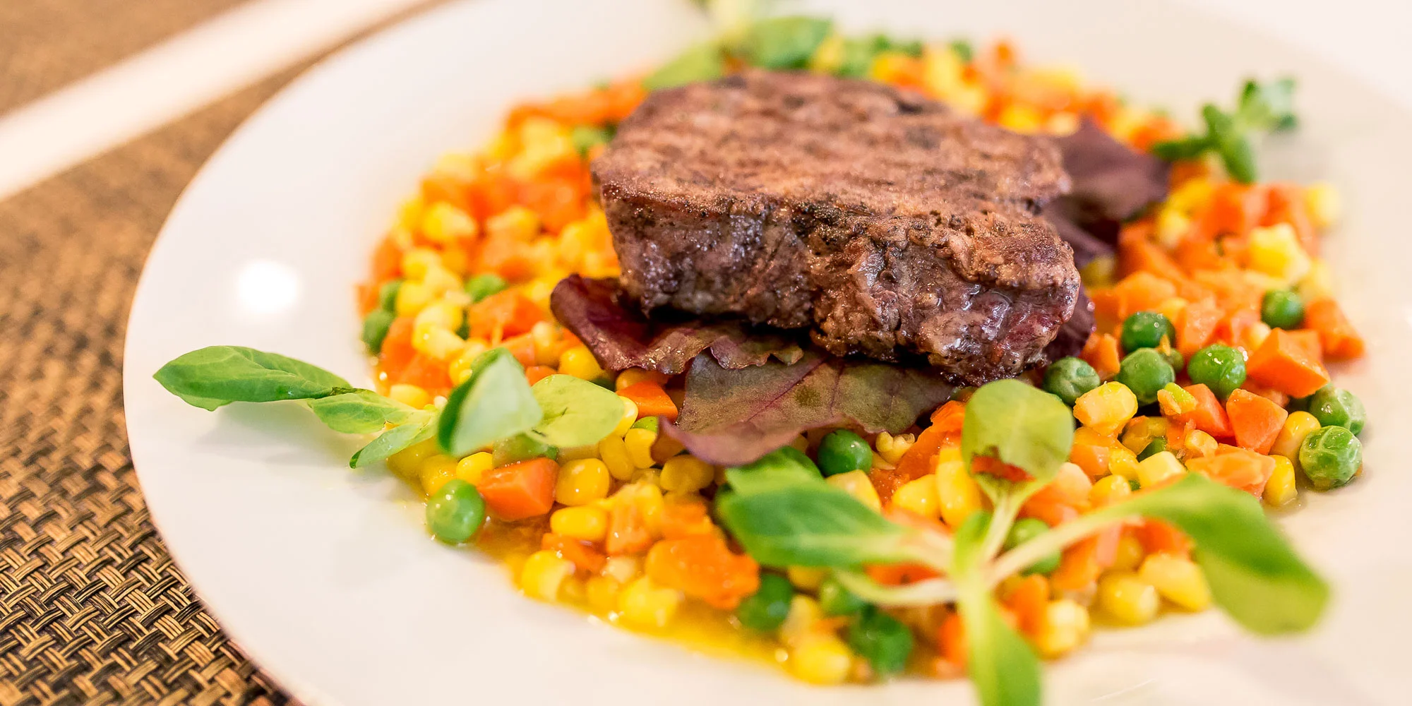 Chutný steak z pravej hovädzej sviečkovice s anglickou zeleninou alebo s bylinkovým maslom a hriankou. K steaku si samozrejme môžete vybrať aj omáčku i prílohu.