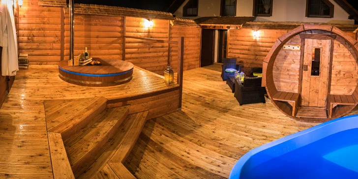 - vstup do novo vybudovaného vidieckeho wellness pod holým nebom – fínska sauna, ochladzovacia kaďa – Pomsta gazdinej a horúca kaďa