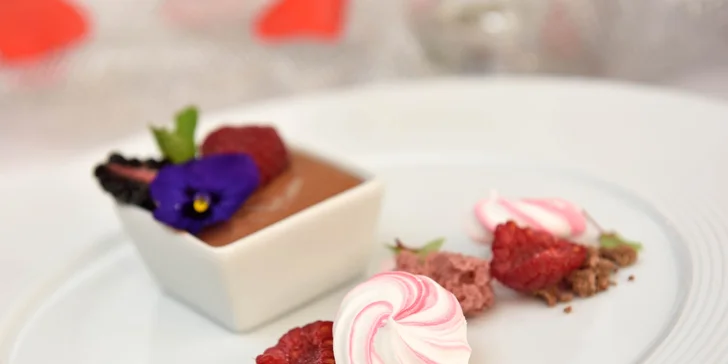 - 90g Čokoládový krém a snehové pečivo podávané na čokoládovej mrveničke a malinovej pene