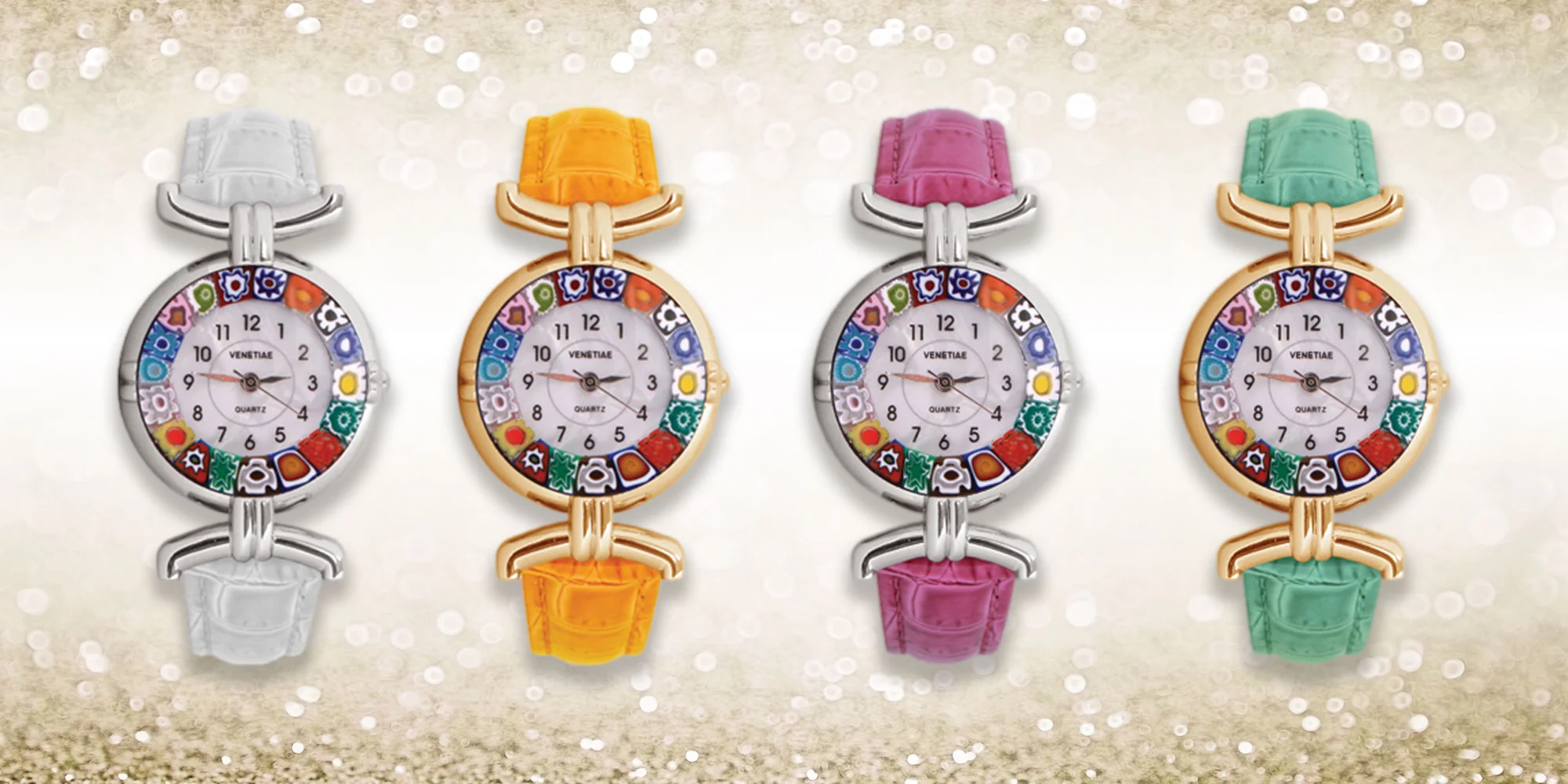 Prekrásny darček pre každú ženu či dievča. Vyberte si hodinky so zlatým alebo strieborným ciferníkom. Ciferník je zdobený kamienkami z muránskeho skla.