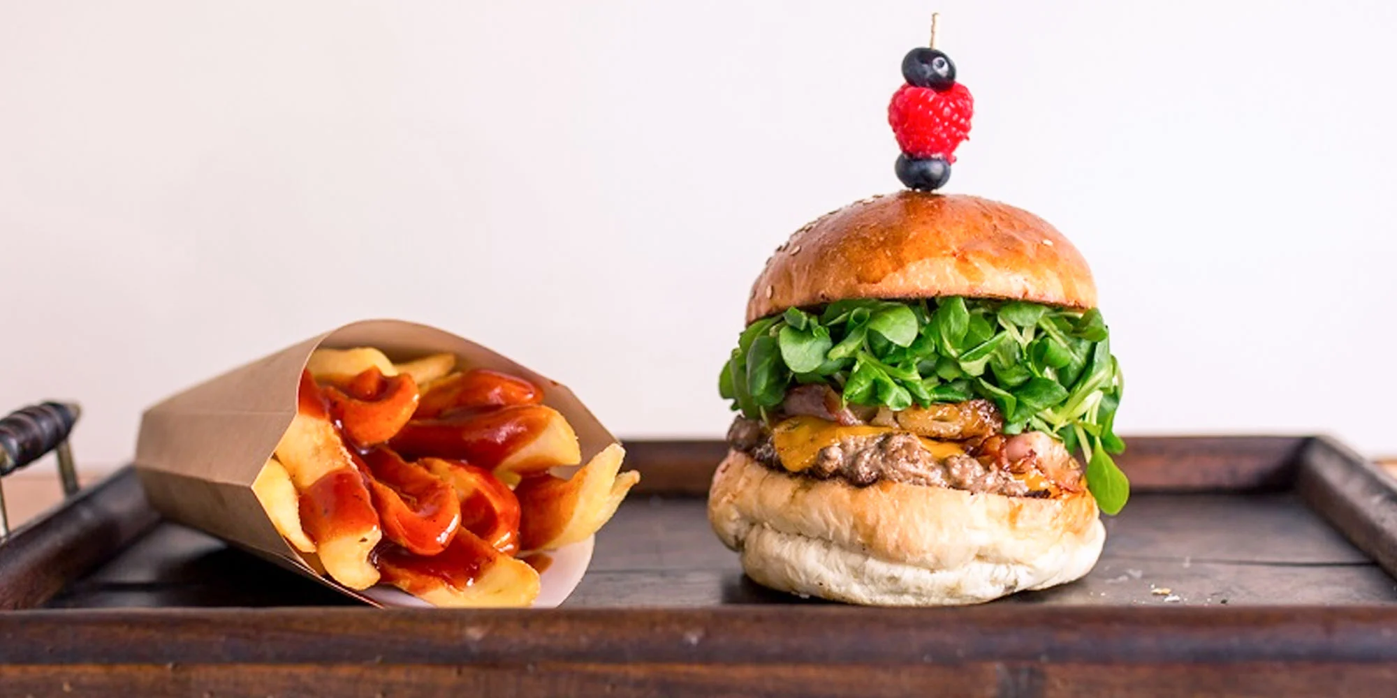 - 360 g BURGER CHILLI CHOCO ( Žemľa, hovädzie mäso, čedar, slanina, cibuľa, omeleta, šalát, chilli – choko, barbecue dressing, cesnakový dressing )