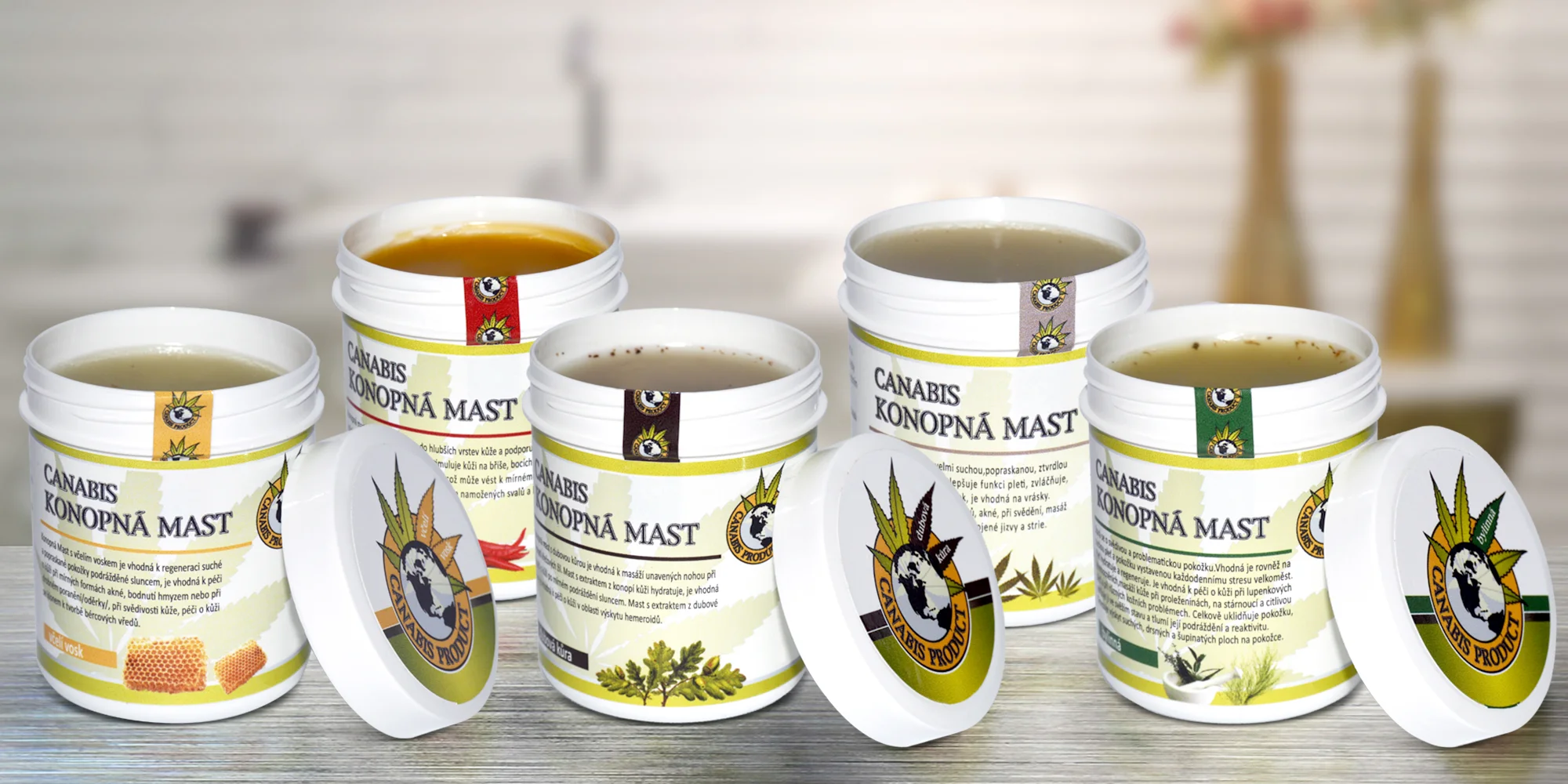Konopná masť čistá Petrolatum, Cannabis Sativa Stem/leaf Extract Konopná masť s bylinkami Petrolatum, Cannabis Sativa Stem/leaf Extract, Angelica Archangelica seed extract, Chamomilla Recutita flower extract, Calendula Officinalis flower extract, Aesculus Hippocastanum flower extract, Sambucus Nigra flower extract, Verbascum Densiflorum flower extract, Lavandula Angustifolia flower extract, Galium Aparine extract, Quercus Robur Bark extract, Lamium Album flower extract, Symphytum Officinale leaf extract, Hedera Helix leaf extract, Chlorella Vulgaris extract. Konopná masť s chilli Petrolatum, Cannabis Sativa stem/leaf extract, Capsicum Frutescens fruit extract Konopná mast s včelím voskom Petrolatum, Cannabis Sativa stem/leaf extract, Cera Alba Konopná masť s dubovou kôrou Petrolatum, Cannabis Sativa stem/leaf extract, Quercus Robur Bark extract |