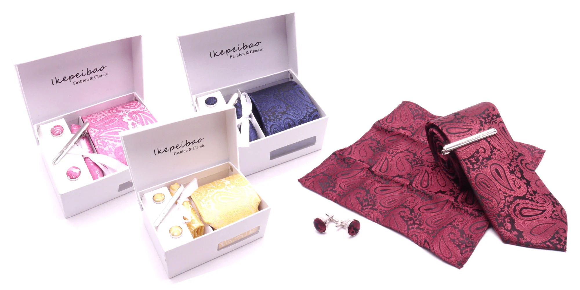 Spolu s luxusnou kravatou sa v darčekovej krabičke vyníma aj vreckovka a manžetové gombíky – všetko zladené v jednom dizajne. Ako bonus je tam aj spona na kravatu.