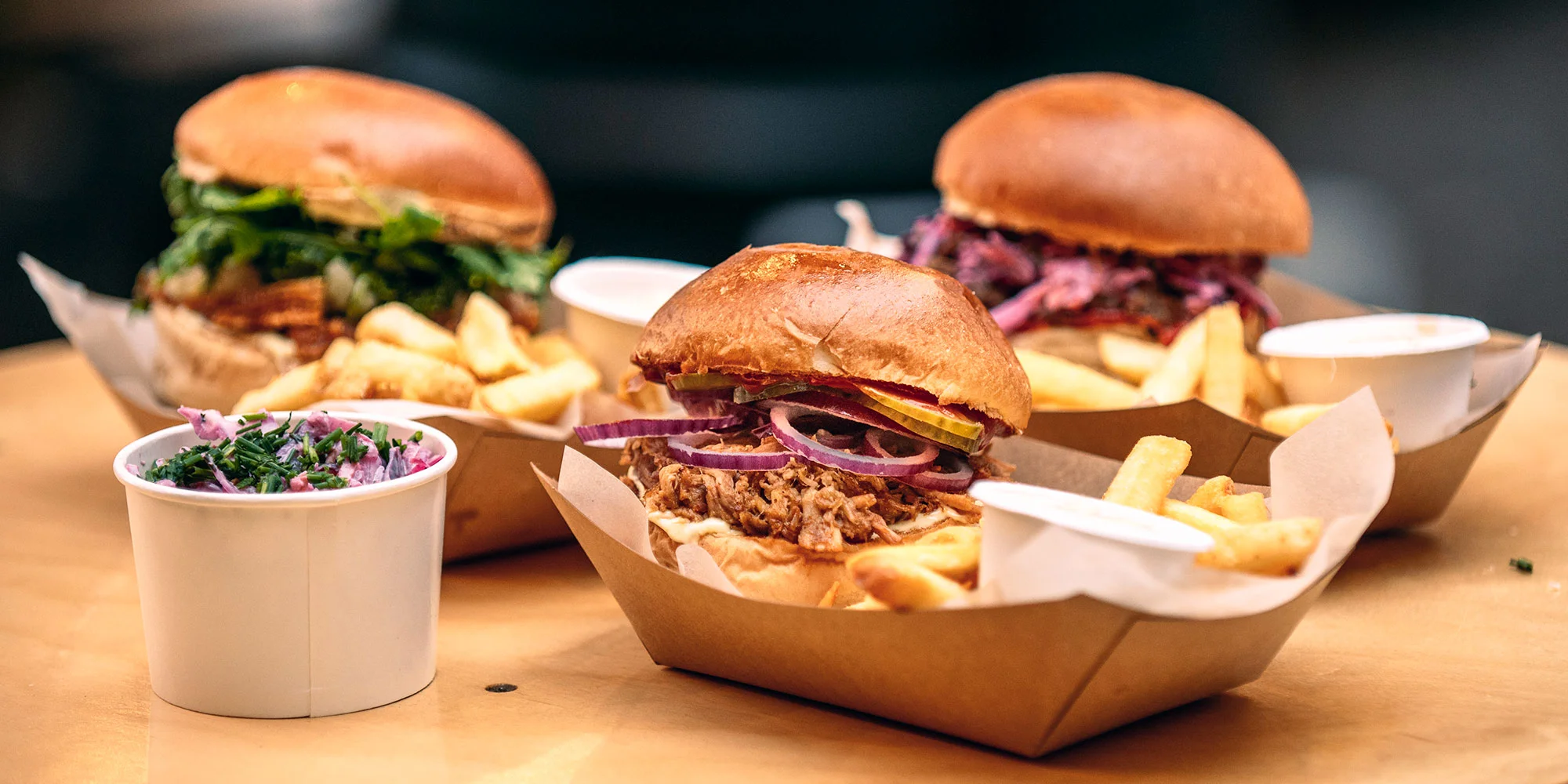 Pre burgrových nadšencov je v ponuke veľké množstvo týchto pochúťok s pomaly pečeným hovädzím či bravčovým mäsom, domácou BBQ omáčkou a bohatou oblohou. Nezabúda sa ani na vegetariánov, pre ktorých je k dispozícii Vegetariánsky špeciál burger s grilovaným ovčím syrom.