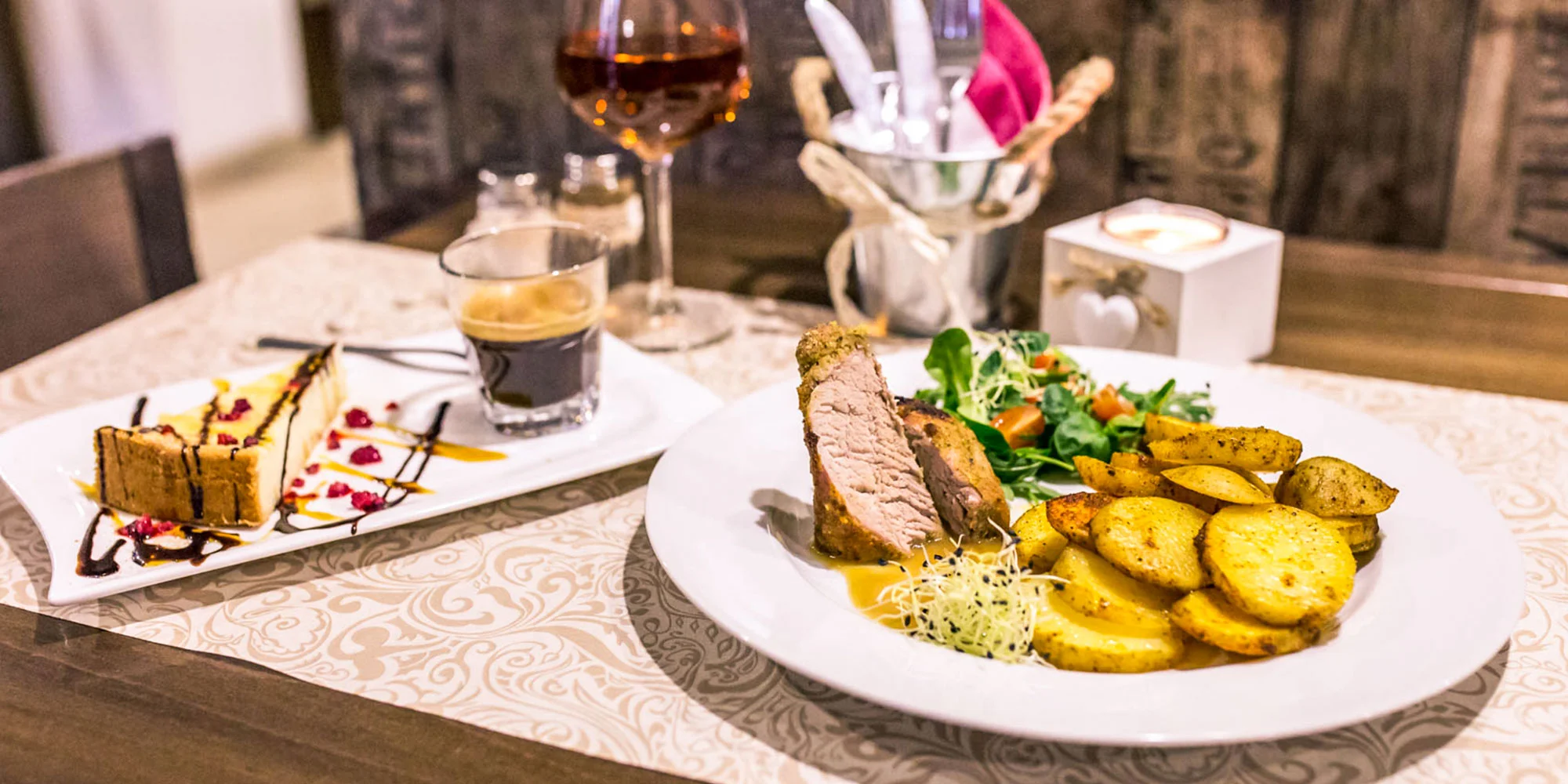 150 g Bravčová panenka v bylinkovej cruste s pečenými zemiakmi a omáčkou, dezertom a vínom pre 1 osobu