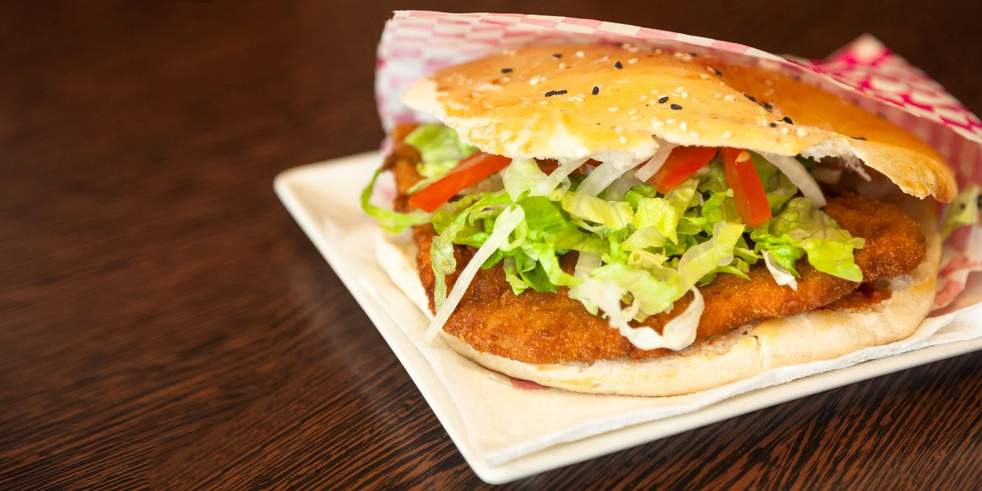 - kuracie mäso 90g, žemľa, kečup, zeleninová obloha
