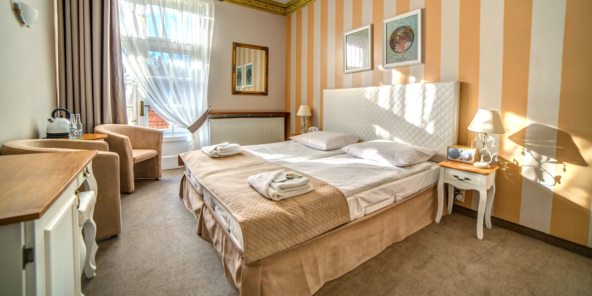 Tradícia a atmosféra interiérov udržiavaných v secesnom štýle vám zaručia príjemný výlet do čias minulých. Ubytujete sa v izbe Premium, v ktorej nájdete manželskú posteľ, vlastné sociálne zariadenie, rýchlovarnú kanvicu aj TV s plochou obrazovkou. Bezplatné Wi‑Fi pripojenie je samozrejmosťou v celom penzióne.