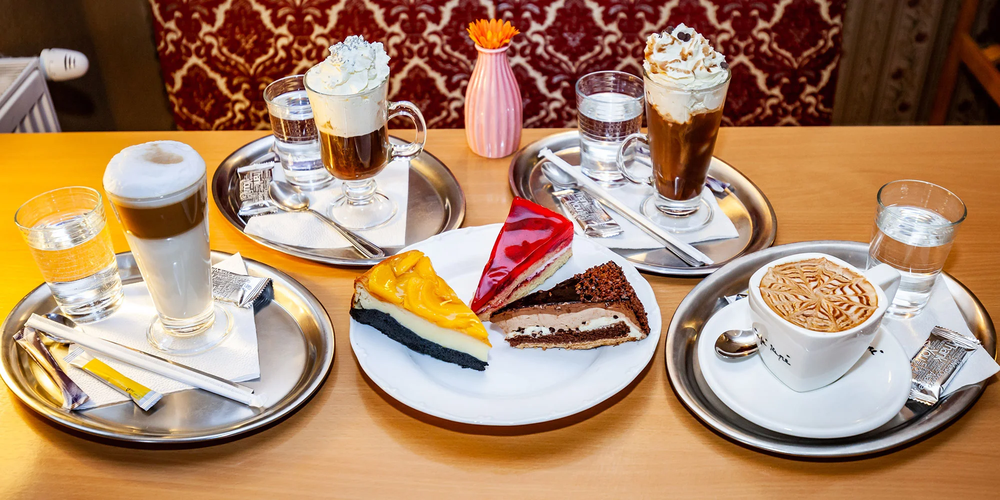 Vychutnajte si tu lahodné espresso, cappuccino, latté, viedenskú alebo ľadovú kávu. A aby toho nebolo málo, doprajte si k tomu aj koláčik podľa vlastného výberu – broskyňový cheesecake, čokoládovú mousse tortu alebo ovocnú želé tortu. Jednoducho sladké potešenie pre každého!
