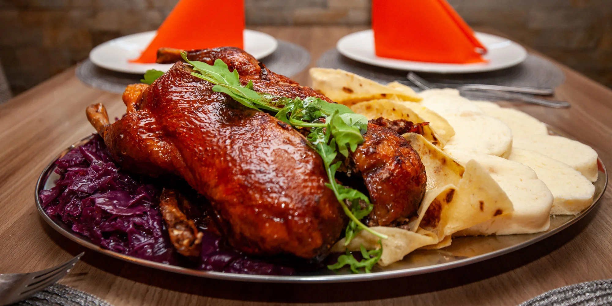 Pohľad na upečené kačacie mäso, ktoré priam odpadáva od kosti, je ako predohra na koncerte klasickej hudby – naozaj dobrá, no kvôli nej lístok nikto nekupuje. Hlavná symfónia sa vo vašich ústach rozoznie až vo chvíli, keď sa vám kúsky jemnej kačaciny a mastenej lokše zosynchronizujú do nádhernej symbiózy chutí, spolu so šťavnatou dusenou kapustou.