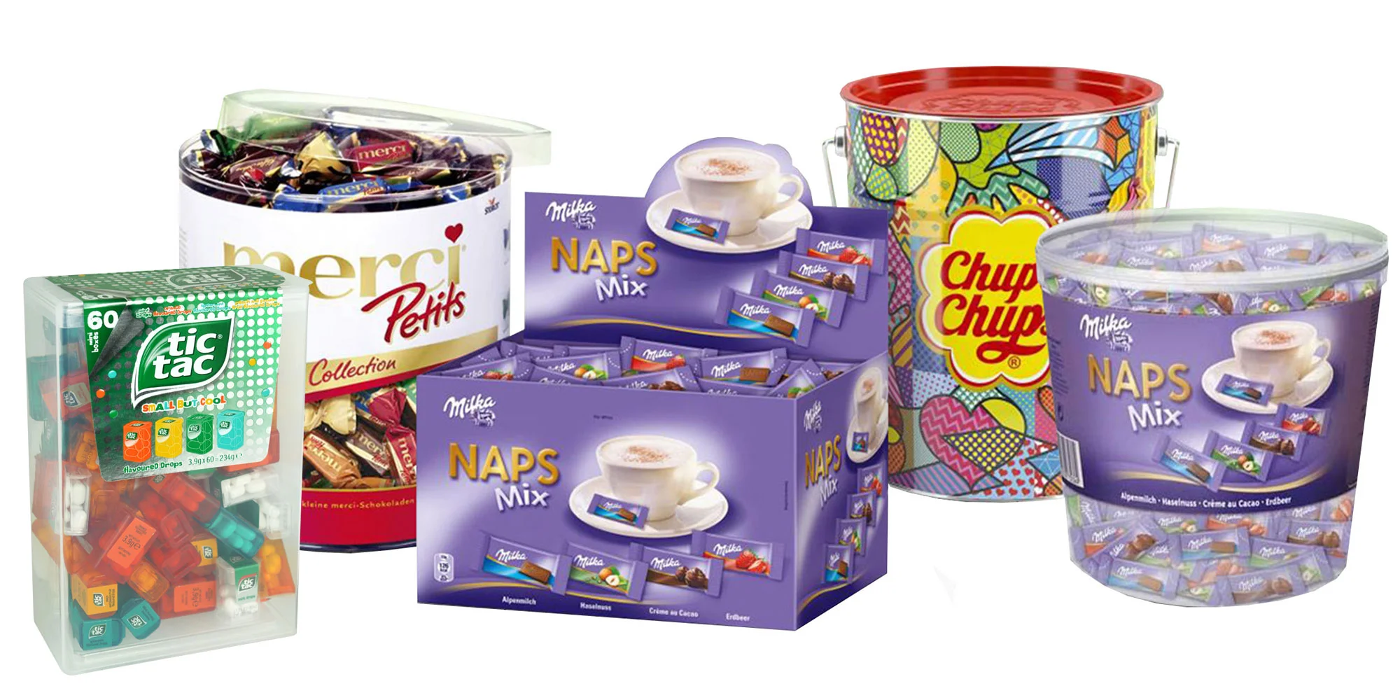 Milka Naps mix 543.00 kilokalorií (kcal) energia: 2,268.00 kJ (kJ) sacharidy: 56 z toho cukry 55 vláknina: 2, tuk: 32, z toho nasýtené tuky 18 bielkoviny 6,2 soľ: 0,38 Ritter Sport Quadretties 542.00 kilokalorií (kcal) energia: 2253.00 kJ (kJ) tuk: 32,00 tuku, z toho nasýtených 18.00 sacharidy: 54,00 z toho cukor: 51,00 proteín: 7,10 soľ: 0,18 Toblerone mix box 535.00 kilokalorií (kcal) energia: 2,240.00 kJ (kJ) sacharidy: 57,50 z toho cukor: 56,00 vláknina: 3,70 tuk: 30,50 z toho nasýtené 18.50 proteín: 6,00, soľ: 0,13 Merci Petits 572.00 kilokalórií (kcal) energia: 2382.00 kJ (kJ) tuk: 38,00 tuku, nasýtených mastných kyselín: 21,60 sacharidy: 48,50 sacharidy z toho cukor: 47,10 proteín: 7,50 soľ: 0,19 Milka Naps 543.00 kilokalórií (kcal) energia: 2,268.00 kJ (kJ) sacharidy: 56 z toho cukry 55 vláknina: 2, tuk: 32, z toho nasýtené tuky 18 bielkoviny 6,2 soľ: 0,38 Mini mentos ovocné energia 389 kcal / 1651 kJ tuky / z toho nasýtené mastné kyseliny 1,7g / 1,7g sacharidy / z toho cukry 92 g / 71 g vláknina 0 g bielkoviny a 0,1 g soľ Mini Mentos mentolové energia 390 kcal / 1656 kJ, tuky / z toho nasýtené mastné kyseliny 1,8 g / 1,6 g sacharidy / z toho cukry 94 g / 71 g, bielkoviny a 0,1 g soľ Chupa Chups plechovka energetická hodnota 1646 kJ / 388 kcal tuky 0,3 g z toho nasýtené mastné kyseliny 0,2 g sacharidy 95 g z toho cukry 78 g bielkoviny 0 g soľ 0,13 g Party mix Energia (kJ): 1656/395 kcal, sacharidy 96 g z toho cukry 79 g, tuk 0,3 g, bielkoviny 0 g, soľ 0,13 g Zloženie Party mixu: Chupa Chups Skull, lízatko s jahodovou / limetkovou príchuťou. Zloženie: cukor, glukózový sirup, okysľujúce činidlo (kyselina mliečna, kyselina citrónová, kyselina jablčná), regulátory kyslosti (hydrogénuhličitan sodný, citran sodný), príchute, koncentrát spiruliny, farbivá (červená repa, kurkumín). Melody Pop: lízatko s jahodovou príchuťou. Zloženie: cukor, glukózový sirup, okysľujúce činidlo (kyselina citrónová, kyselina jablčná, kyselina mliečna), farbivo (červená repa), aróma. Môže obsahovať stopy mlieka. Chupa Chups Mini lízatko Rozmanité príchute. Zloženie (jahoda, jablko, pomarančová príchuť): cukor, glukózový sirup, ovocná dreň (3%) (jablko, čerešňa, malina, pomaranč, ananás, vápno, citrón, banán, jahoda, broskyňa, čučoriedka, ostružina, mango, melón, kivi), okysľujúce látky (kyselina mliečna, kyselina jablčná, kyselina citrónová), príchute, farby (kurkumín, paprikový extrakt, červená repa). Zložky (Cola Flavour): cukor, glukózový sirup, kyselina mliečna, kyselina jablčná, kyselina citrónová, príchute, farbivá (Amonosulfit Sugar Caraway). Chups Chups lízatko, rôzne príchute: čerešňa, cola, pomaranč. Zložky (pre ovocné príchute): cukor, glukózový sirup, ovocná dreň (jablko, čerešňa, malina, pomaranč, ananás, limetka, citrón, banán, jahoda, broskyňa, čučoriedka, ostružina, mango, melón, kivi) (3%), okyslenie (kyselina mliečna, kyselina jablčná, kyselina citrónová), príchute, farby (kurkumín, pravý karmín). Zložky (pre arómu cola): cukor, glukózový sirup, okysľujúce činidlo (kyselina mliečna, kyselina jablčná, kyselina citrónová), aróma, farbivo (biouhel). Crazy Dips Cola – zloženie: cukor, glukózový sirup, okysľujúce činidlo (kyselina citrónová, kyselina mliečna, kyselina jablčná), príchute, oxid uhličitý, farbivo (amonosulfitový karamel), regulátor kyslosti (uhličitany sodné). Mini Mentos Ovocie s ovocnou príchuťou – zloženie: cukor, glukózový sirup, ovocné šťavy (jahody, jablko, pomaranč, citrón) (2%), kokosový olej, kyselina (kyselina citrónová), škrob, maltodextrín, aromatické látky, kakaové maslo, zahusťovadlo (gellan, celulózová guma, arabská guma), emulgátor (estery cukrov mastných kyselín), poťahovacie prostriedky (karnaubský vosk), farbivá (kurkumín, beta-karotén, antokyaniny, repa).Mentos mentolové: Cukor, glukózový sirup, plne stužený kokosový olej, škrob, prírodná mentolové aróma, maltodextrín, zahusťovadlá (guma gellan, celulózová guma, arabská guma), emulgátor (estery sacharózy s mastnými kyselinami), leštiace látky (karnaubský vosk a včelí vosk)Center Shock Extra kyslá žuvačka s náplňou. Zloženie: cukor, žuvacie guma, glukózový sirup, stabilizátory (sorbitol, glycerín), okysľujúce činidlo (kyselina jablčná, kyselina citrónová Veľké balenie Tic Tac Mixed = 60 malých krabičiek Zloženie: