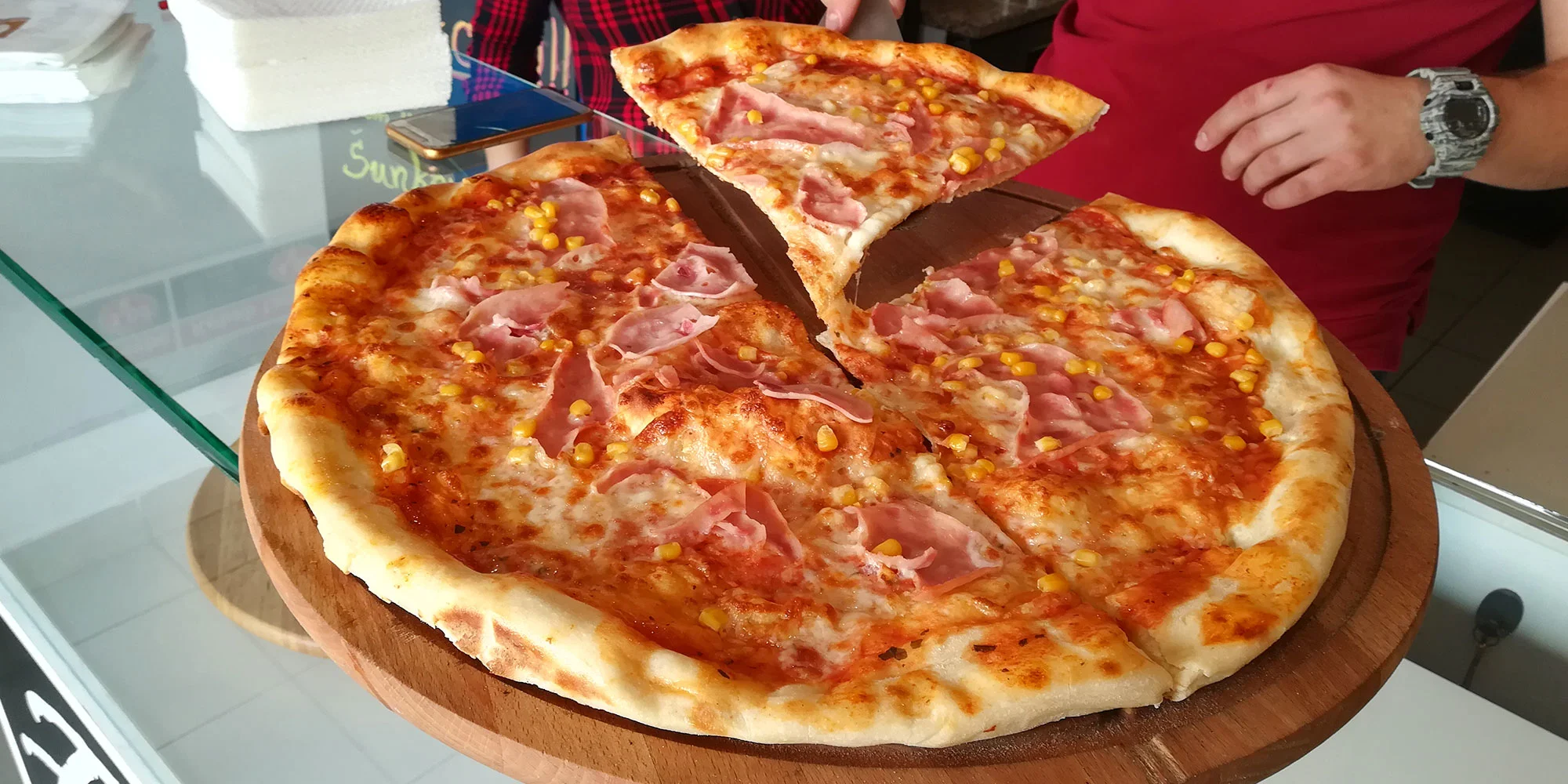 - Šunka – kukurica Pizza (paradajková omáčka, oregano, syr, šunka, kukurica)