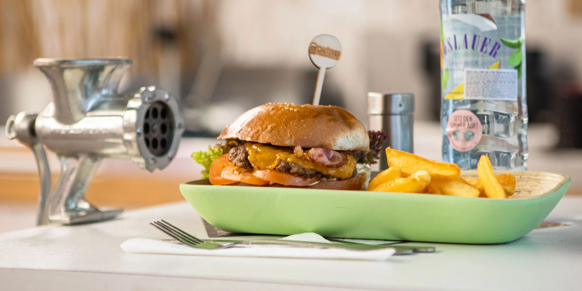 Vychutnať si ho môžete na prevádzke na Americkom námestí alebo vám ho na požiadanie zabalia so sebou. Použité 100 % hovädzie mäso pochádza zo Slovenska, celkovú chuť burgeru v domácej žemli dopĺňa jemná majonéza, syr cheddar, rajčina, uhorka a BBQ omáčka. Dostanete k nemu aj porciu hranolčekov a ochutenú minerálnu vodu na uhasenie smädu.