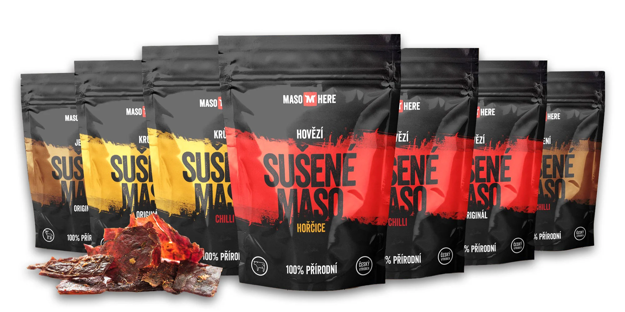 Česká firma Maso Here, vám teraz ponúka ozajstnú lahôdku – 100% prírodné sušené mäso. Pri výrobe sa používa iba prvotriedne hovädzie, morčacie a jelenie mäso, štipka soli, unikátnu zmes korenín a kvapka octu. Na nejaké éčka, dochucovadlá alebo lepok v tomto balení nie je miesto. Skrátka len na mäso a trochu korenia.
