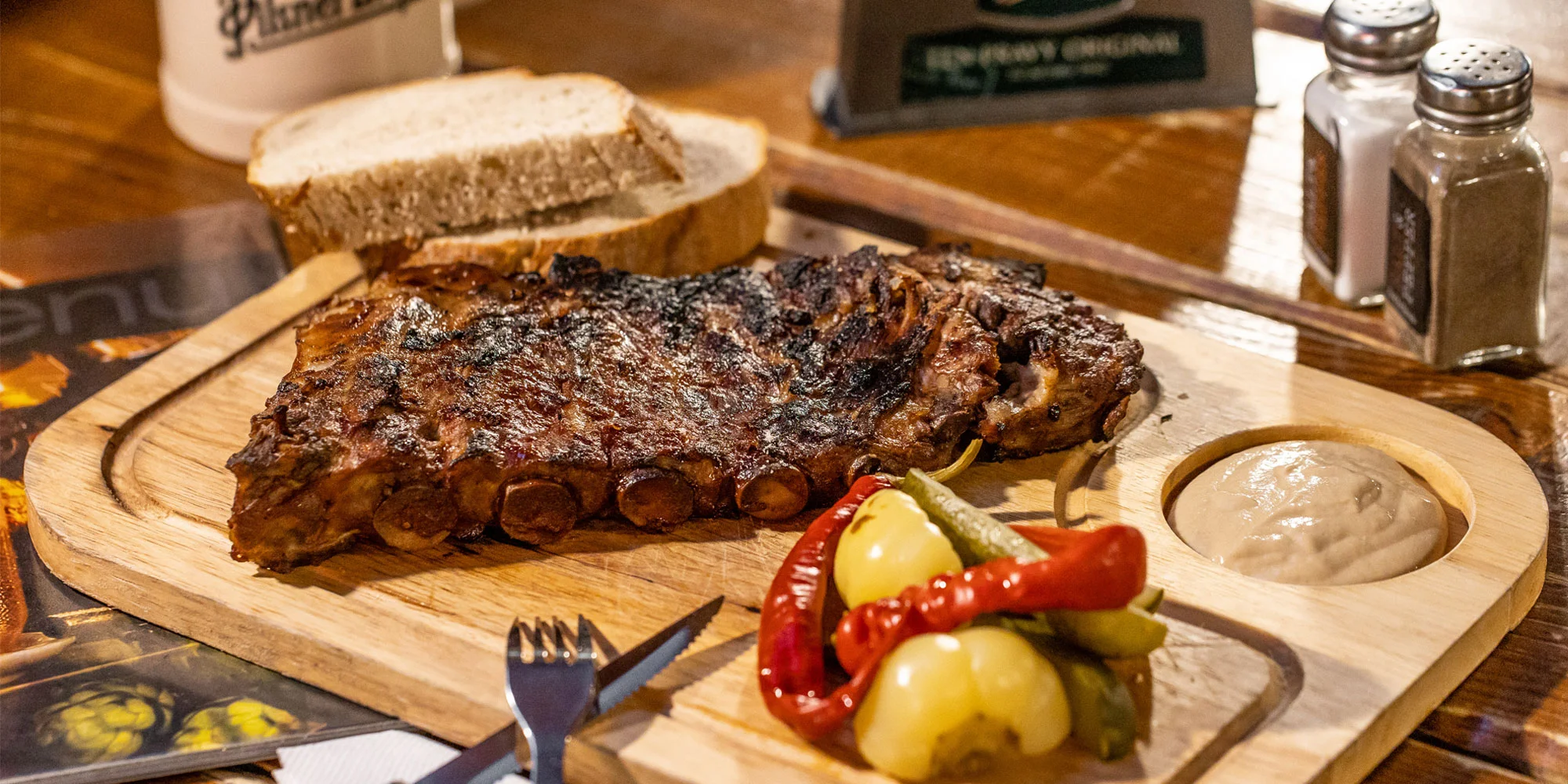 Chutné rebrá s chlebom, horčicou, baraními rohmi, uhorkou a paprikou spláchnete tým najlepším chladeným pivom Pilsner Urquell, ktorý sa čapuje priamo z tankov.