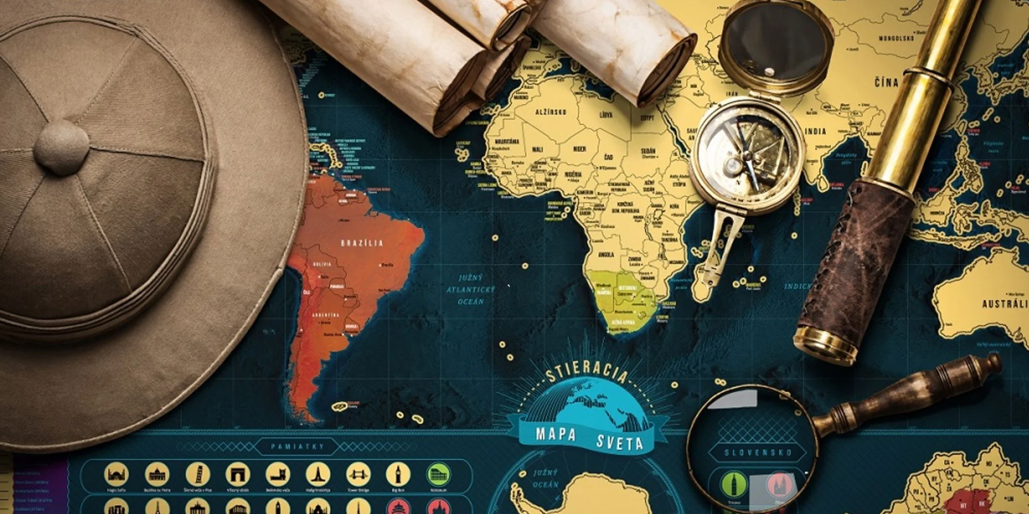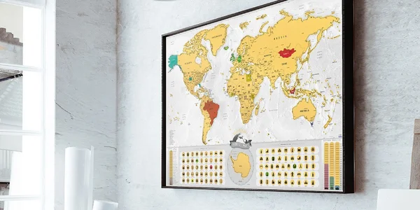 Ak radi cestujete, cestovateľská mapa je skvelou dekoráciou na stenu do vášho bytu. Môžete si na nej zotrieť už navštívené destinácie a spomínať na svoje cesty po svete. Navštívené miesta zotriete jednoducho, ako výherný los, pričom výhrou budú vaše spomienky na dané miesto. Mapa je vyrobená z dvoch vrstiev. Horná je fólia, ktorú môžete zotierať mincou alebo kartou, čím sa odhalí spodná vrstva mapy, ktorá je inej farby a tak bude pekne vidieť, ktoré miesta ste už navštívili.