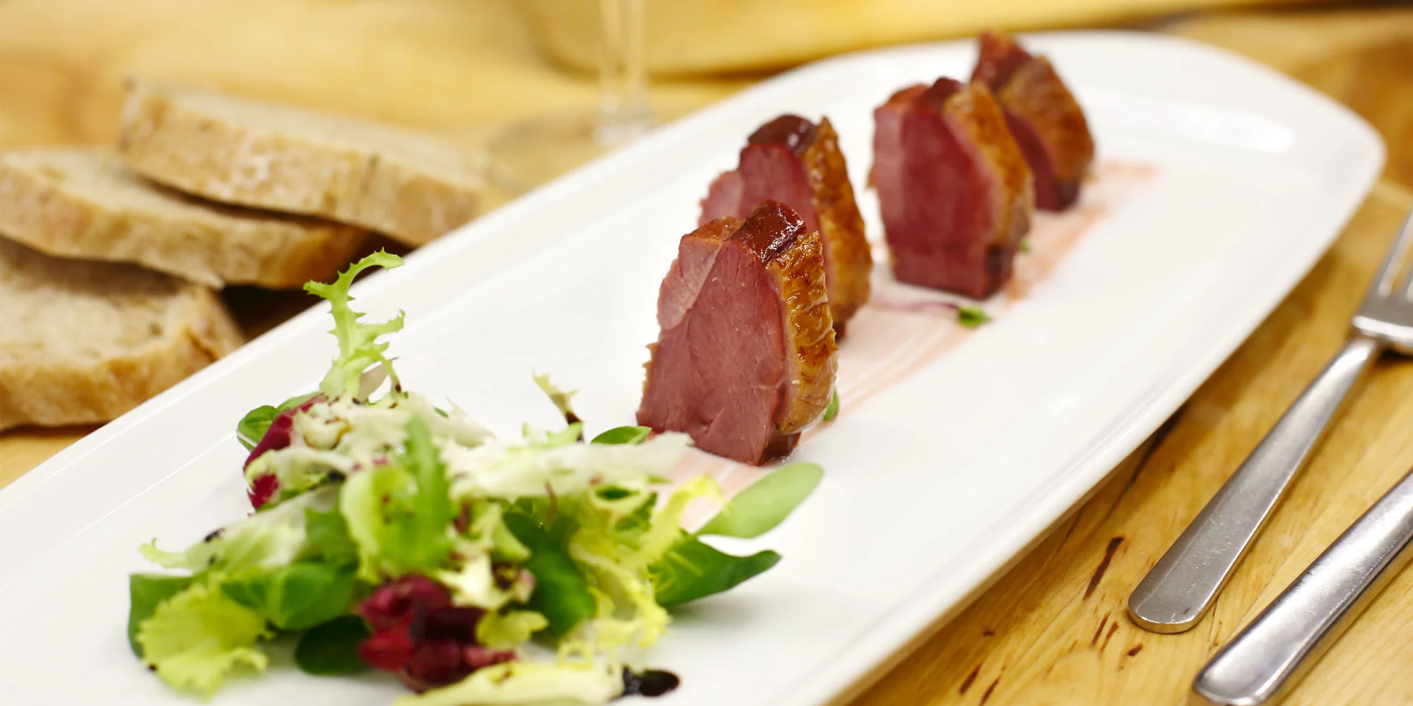 - 150 g Ľahko zaúdené kačacie prsia, 50 g mladý šalát a 100 g pečené zemiaky