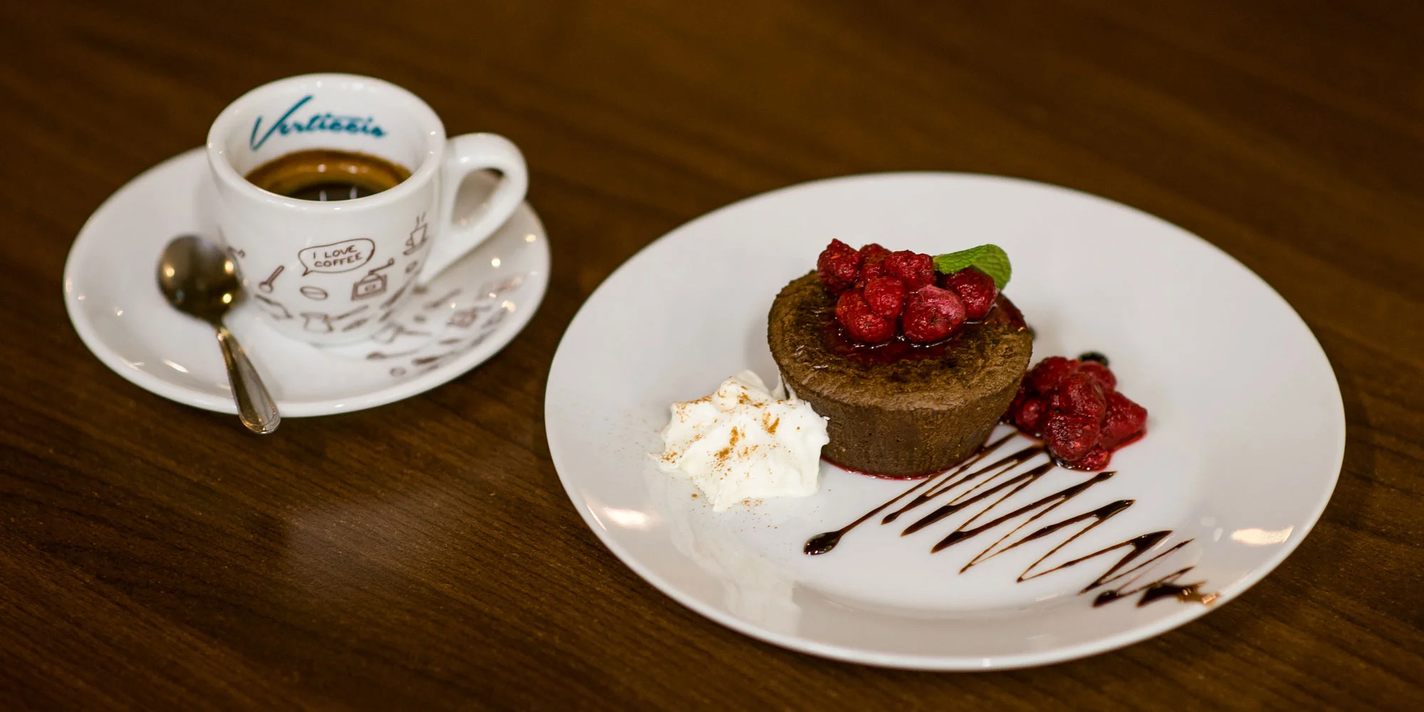 1 × 80 g Lávový koláč s malinami, šľahačkou a toppingom + káva alebo čaj podľa vlastného výberu