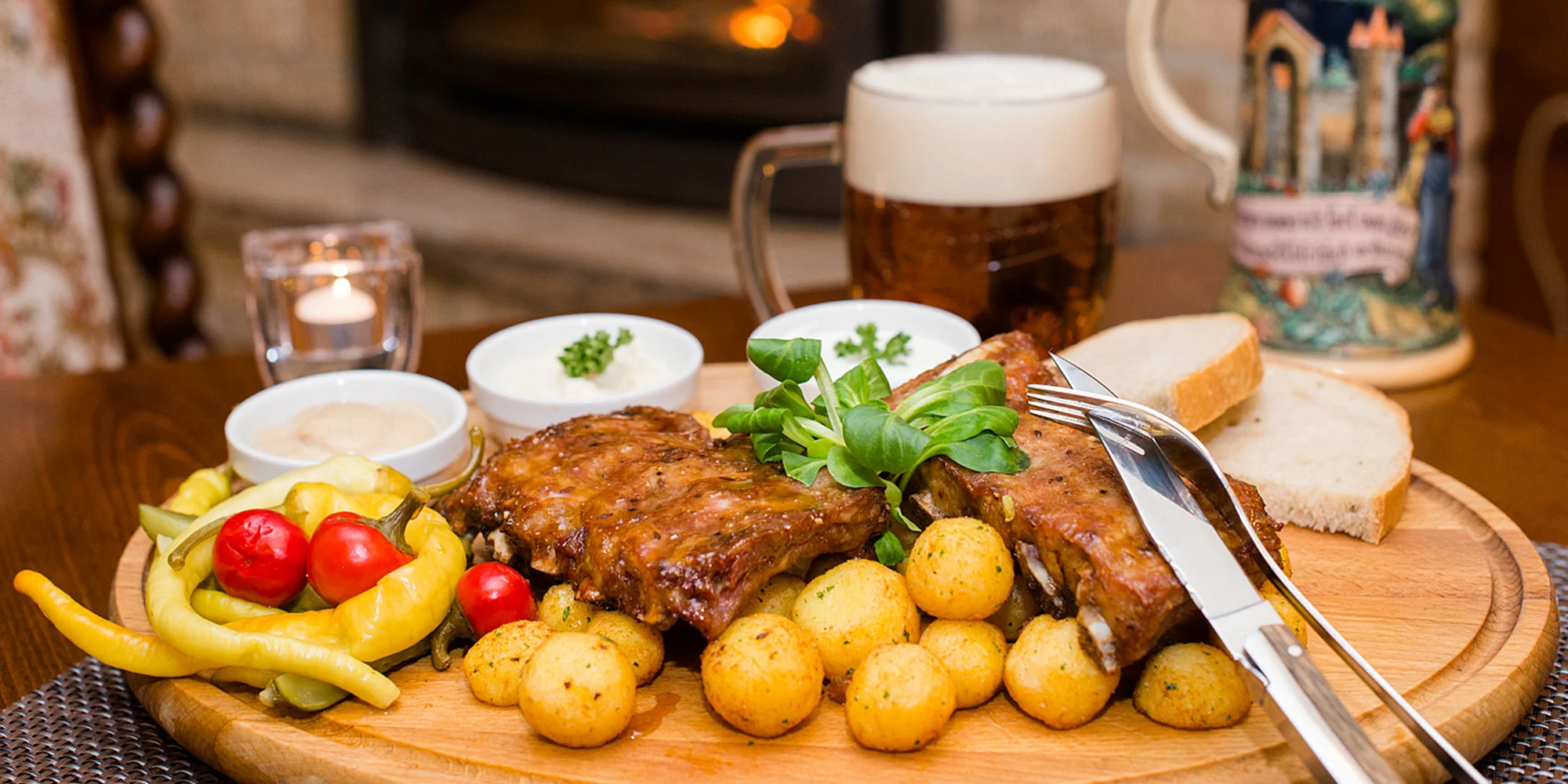 - Bravčové rebrá, opekané zemiaky, horčica, cesnakový dresing, chren, kyslé uhorky, baranie rohy, chlieb