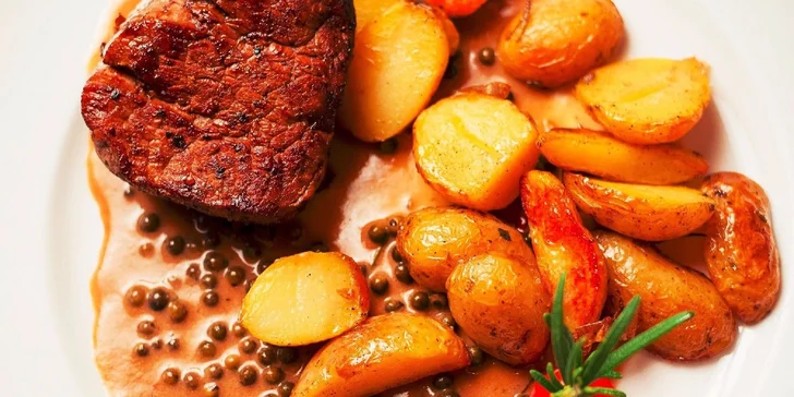 - 200 g Hovädzí “Pfeffer” steak (steak na zelenom korení) s opekanými zemiakmi