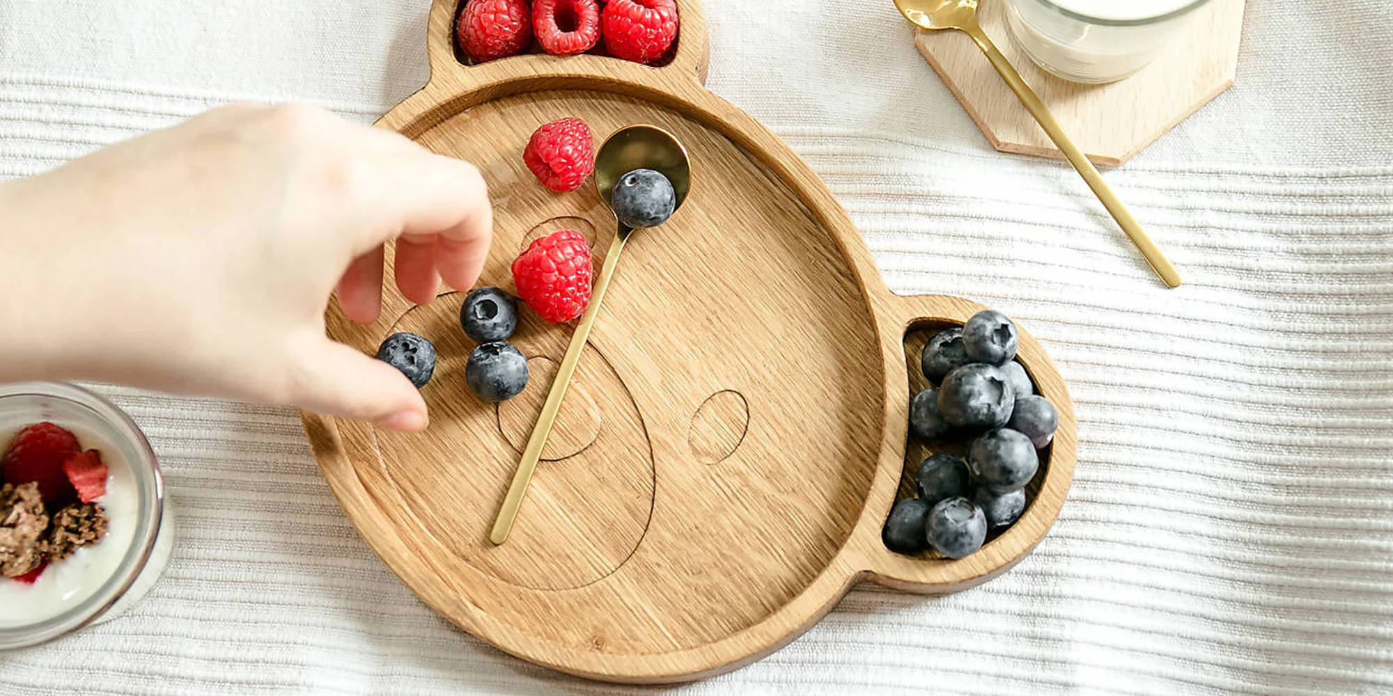 Rozkošné drevené tanieriky v tvare macka, prasiatka alebo pandy budú potešením pre všetky deti a spríjemnia ich chvíle strávené pri stole. Pre svoj hravý dizajn a prevedenie sa stanú super „spoločníkmi“ pre menšie aj väčšie deti. Na Slovensku vyrobené tanieriky z dubového dreva sú vyrobené drevorezbárskou technikou. Drevo je ošetrené kvalitným olejom, ktorý je nie je škodlivý a môže prísť do styku s potravinami.