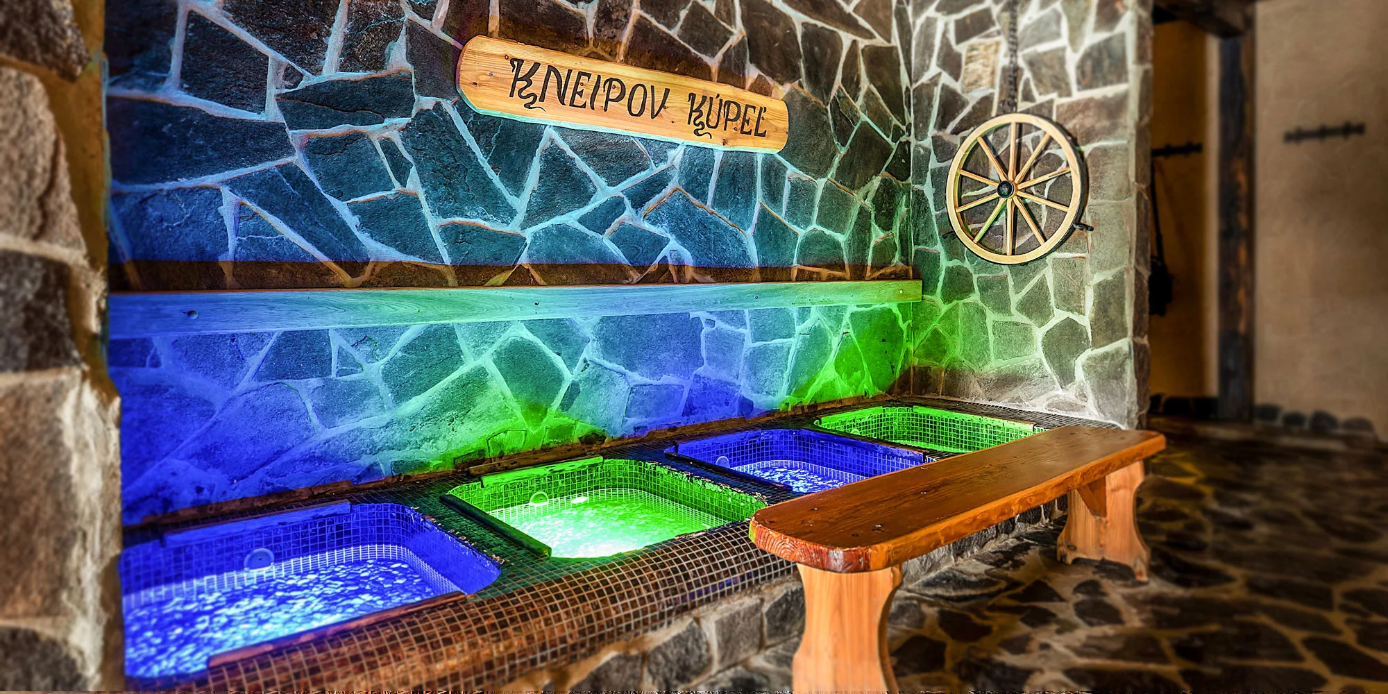 - VODNÝ SVET: jaskyňa s hydromasážou, vírivá rieka, masážne sedadlá, masážne lehátka, plavecký bazén s protiprúdom, masážna lopata, káčer, saxofón, hríbik, wellness bar, detský kútik
