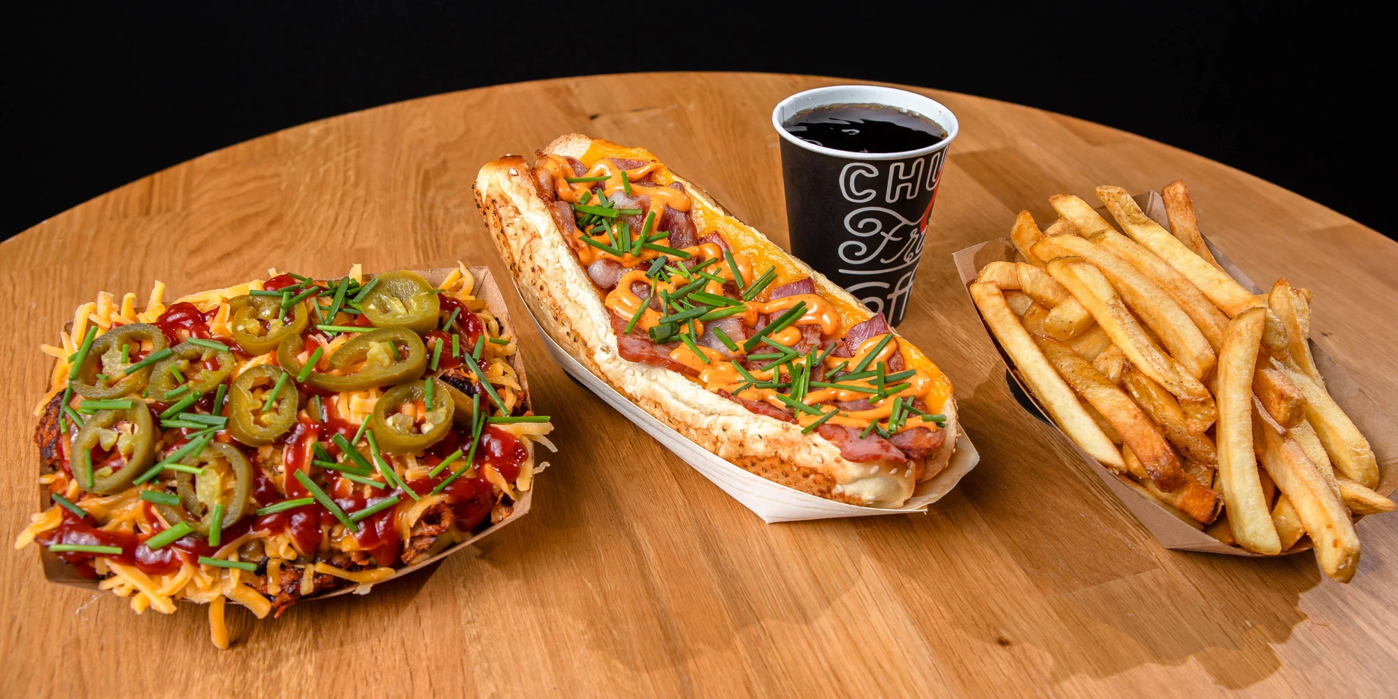 - 300g Bacon & Cheese Hot dog + malé hranolky + bezodný nápoj - Brioškové pečivo, grilovaný párok, cheddar, slanina, sriracha majonéza, pažítka