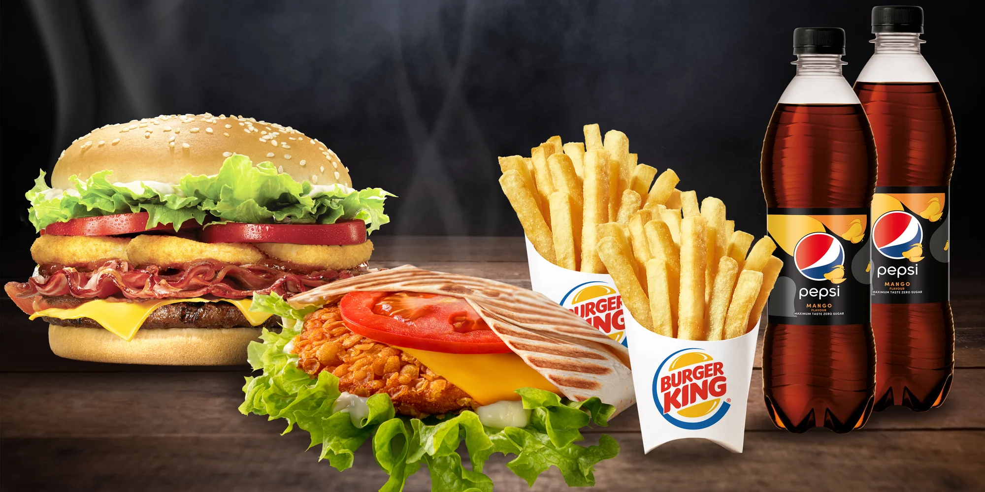 Nechajte sa aj vy zlákať kráľovskými dobrotami a vychutnajte si ich v rámci novej akcie 1+1 stredné menu. Každé obsahuje vybraný burger alebo wrap, stredné hranolčeky a 0,5 l Pepsi mango.