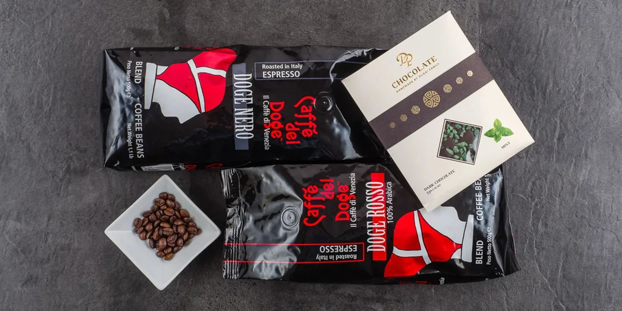 Vybrať si môžete z 2 a 3-dielnych balíčkov prémiových káv z Benátok s horkou čokoládou. V darčekovom balení nájdete života budič v podobe pražených káv Doge Nero a Doge Rosso. Skutoční pôžitkári si tento nápoj vychutnajú v akejkoľvek forme (kapsule, mletá a zrnková verzia). Navyše si môžu dopriať aj malú odmenu, a to horkú čokoládu s mätou, chilli, kryštalickou ružou alebo fialkou.